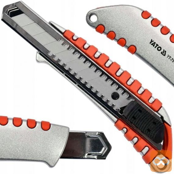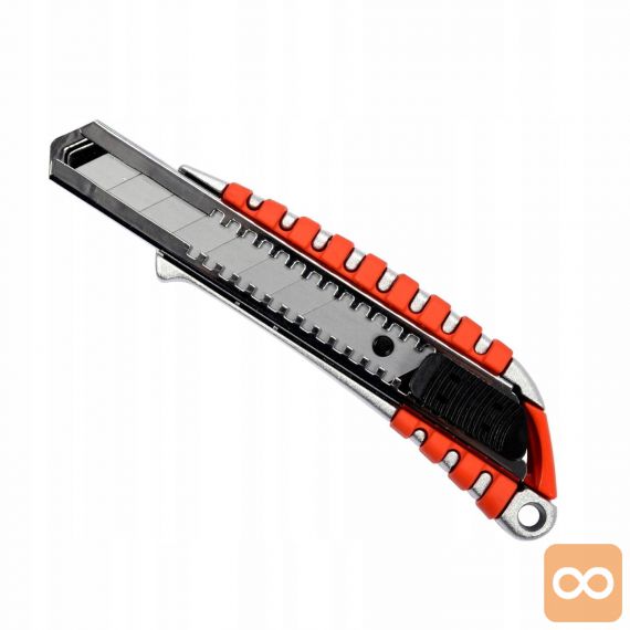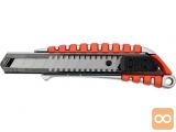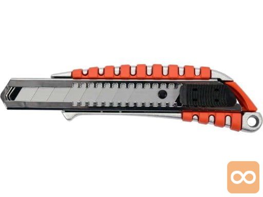 Nož z zložljivim 18 mm zlomljenim rezilom, kovinsko ohišje z nedrsečimi vložki omogoča varno držanje orodja.