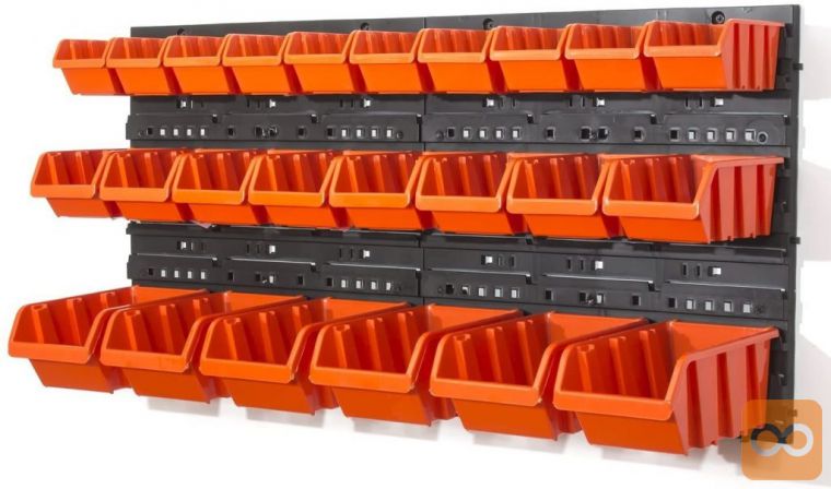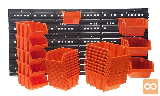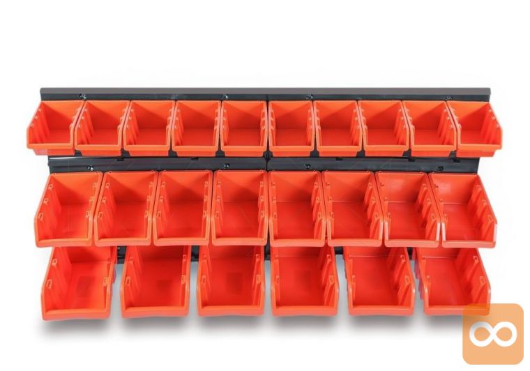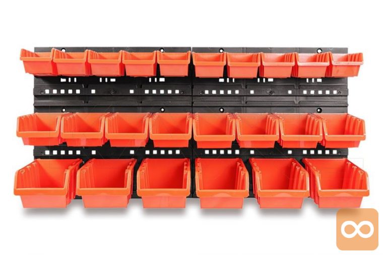 Ne glede na to, ali je v servisni delavnici ali zasebni garaži: ta večnamenski regal, ki ga sestavlja 24 košev, je idealna rešitev za vzdrževanje urejenosti delovnega mesta.