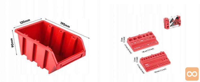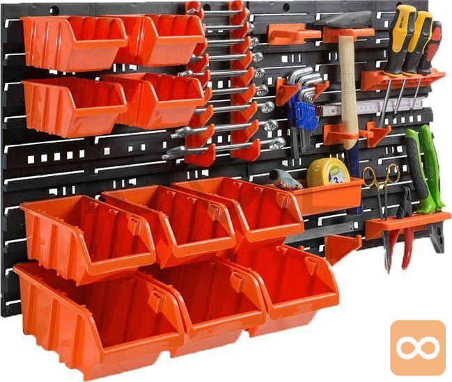 Ne glede na to, ali je v servisni delavnici ali zasebni garaži: ta večnamenski regal, ki ga sestavlja 34 košev, je idealna rešitev za vzdrževanje urejenosti delovnega mesta.