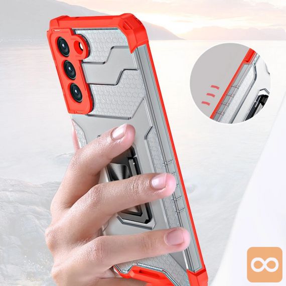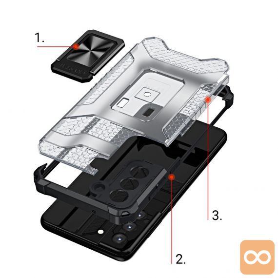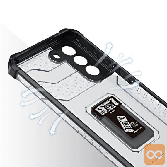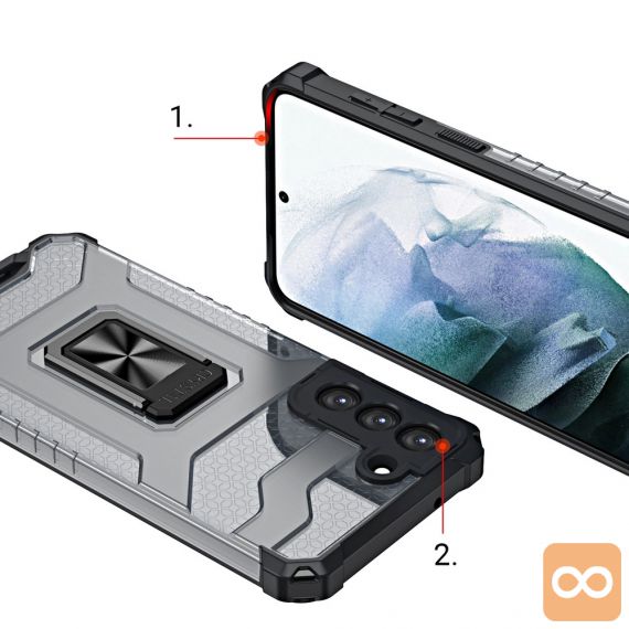• Built-in Ring holder – na hrbtni strani ovitka je vgrajen izjemno praktičen nosilec za prstan, ki ga lahko nataknete na prst in tako bolj varno držite telefon v roki. Omogoča tudi pritrditev telefona na magnetno avtomobilsko držalo.